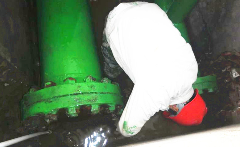 原鹵管線是采鹵崗位重要的組成部分,是停車必檢項(xiàng)之一。但是檢修難度不小,一是過(guò)道空間狹小,光線昏暗,一次僅夠兩個(gè)人同時(shí)作業(yè);二是檢修原鹵管線時(shí),必須“涉水”作業(yè)。檢修期間原鹵管線一閃一閃的焊光將周圍照亮,順著火花向里看去,只見(jiàn)有兩個(gè)人在狹小的空間綣著身子低頭忙活著,感覺(jué)身子都轉(zhuǎn)不開的樣子。他們像小貓似的蜷縮在兩邊,全身濕透,白色的工服也被銹漬染的亂起八糟,被油漬沁透成一坨一坨的,但他們堅(jiān)定的眼神、專注的神情卻叫人佩服。我不禁問(wèn)道:“這么窄的空間人咋進(jìn)去啊?”他們開玩笑的說(shuō):“用縮骨功啊!”