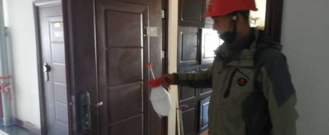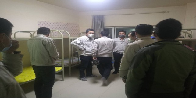 在宿舍,檢查留宿人員、進行衛(wèi)生消毒等“疫情”防控工作。