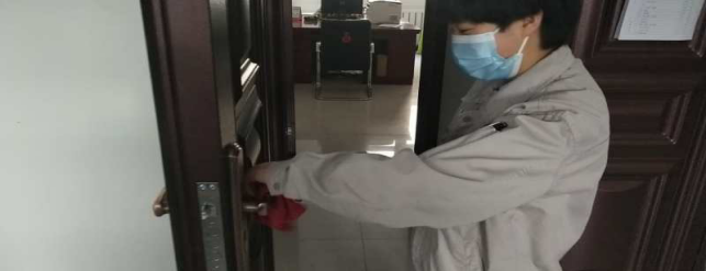 擦拭操作臺(tái)、門(mén)把手,工作的有條不紊。