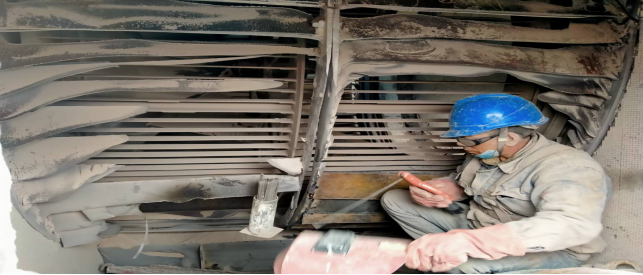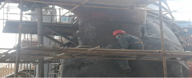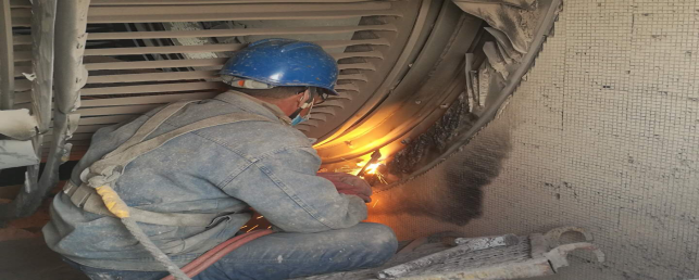 在回轉(zhuǎn)窯,做好更換窯磚前期準備工作——清理深挖4米處窯皮、窯磚。