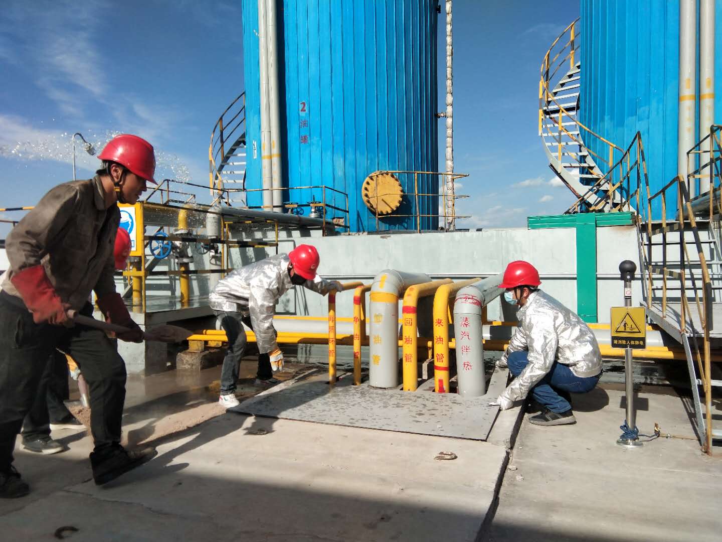 演練以維修工在焊接護欄時將焊渣掉入燃油庫房導(dǎo)流溝引起溝內(nèi)棉紗著火事故為主題,當班調(diào)度接到崗位人員匯報后組織義務(wù)消防員對油罐、回油、來油、再循環(huán)管道進行降溫,并匯報公司啟動應(yīng)急處置預(yù)案進行滅火的事故處置演練過程。