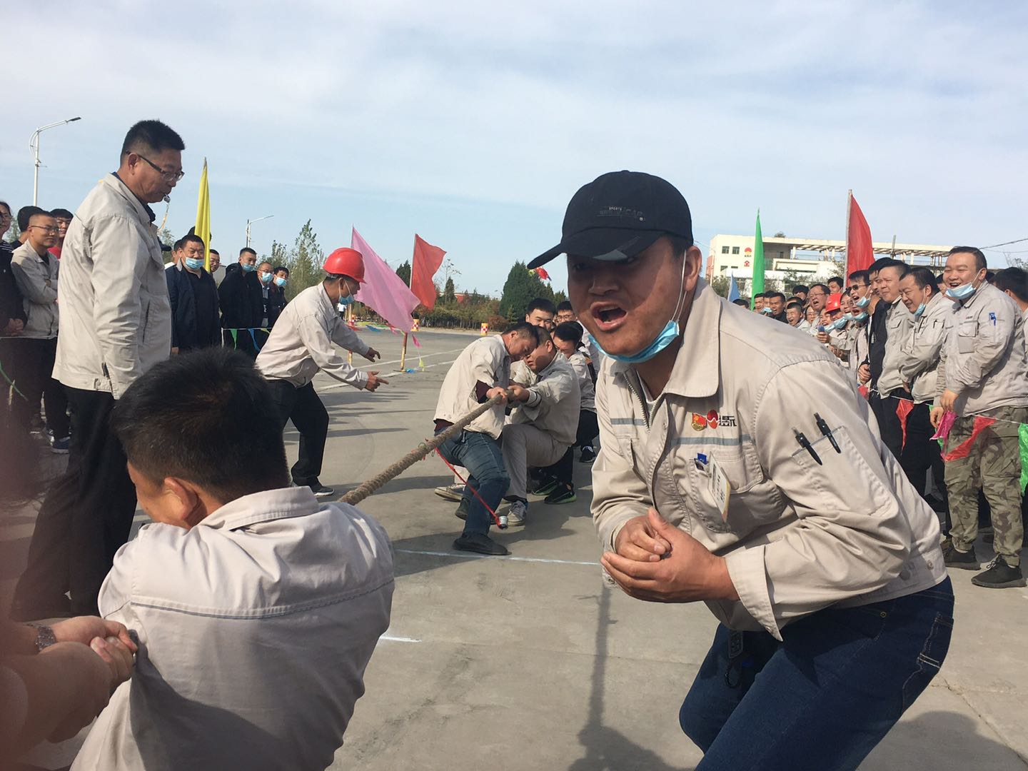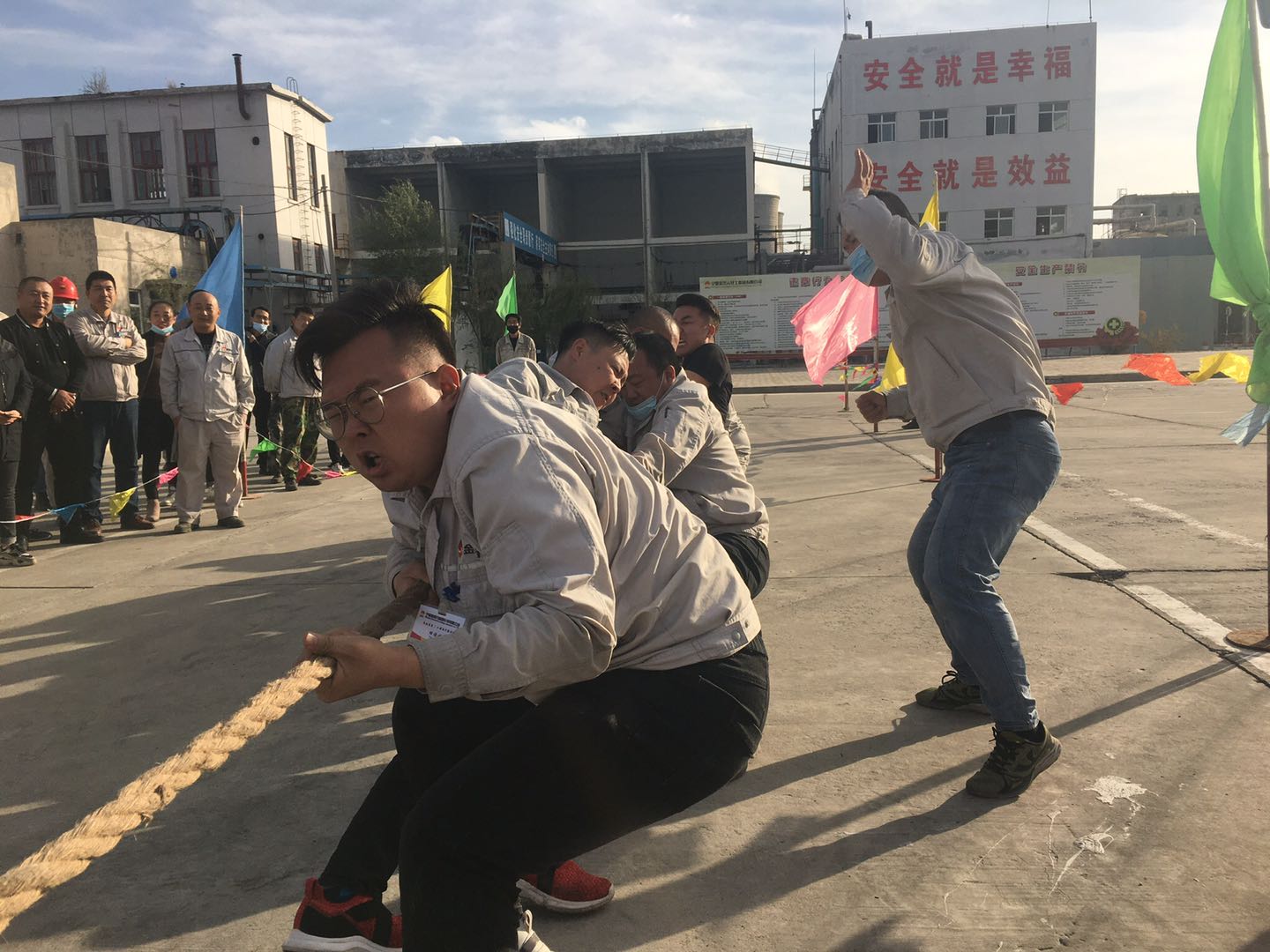 當比賽的哨聲響起,只見參賽的隊員們緊握長繩卯足勁拼命往后拉,有的同志臉憋得通紅卻絲毫不放松,有的“面部猙獰”使盡渾身解數(shù),還有的干脆閉上眼睛卯足了勁兒往后拉。女同志們更是不甘示弱,一個個咬緊牙關(guān),將巾幗不讓須眉的精神風貌發(fā)揚得淋漓盡致。未參賽的員工自發(fā)組成啦啦隊為比賽隊員吶喊加油。哨子聲、吶喊聲此起彼伏,給比賽增添了一抹亮色,每一聲吶喊都帶來一股力量,現(xiàn)場激烈的比賽將整個活動推到了高潮。