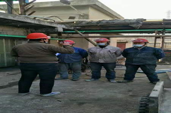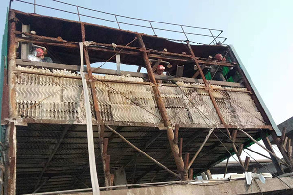 在完成相關(guān)作業(yè)的準備工作,穿戴好各類防護用品,簽發(fā)了各類票證后,大家就進入到檢修現(xiàn)場。加固冷卻塔前,必須先拆除冷卻塔壁板,清洗冷卻塔填料雜物及易燃易爆物質(zhì)。由于冷卻塔結(jié)構(gòu)腐蝕嚴重,填料內(nèi)部含易燃易爆物質(zhì)多,所以必須對冷卻塔進行多次沖洗徹底除去易燃易爆物質(zhì)才能進行動火加固作業(yè)。