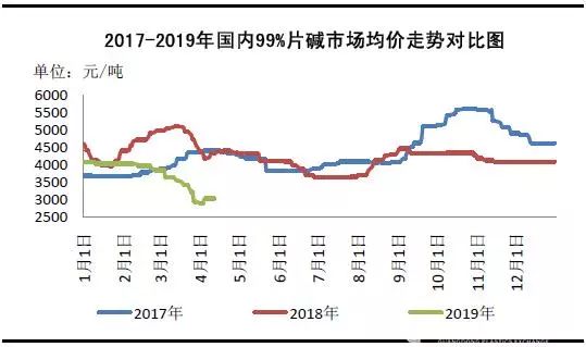 圖1 2017-2019年國內(nèi)99%片堿市場均價走勢對比