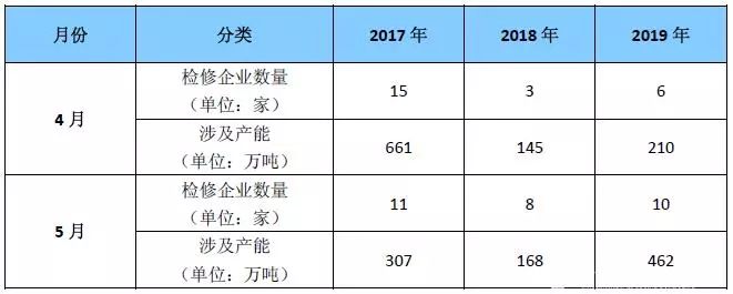 表1 2017-2019年4-5月燒堿檢修廠家及涉及產(chǎn)能統(tǒng)計表