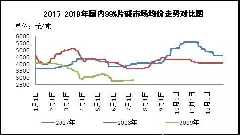 圖1 2017-2019年國內(nèi)99%片堿市場均價(jià)走勢對比圖