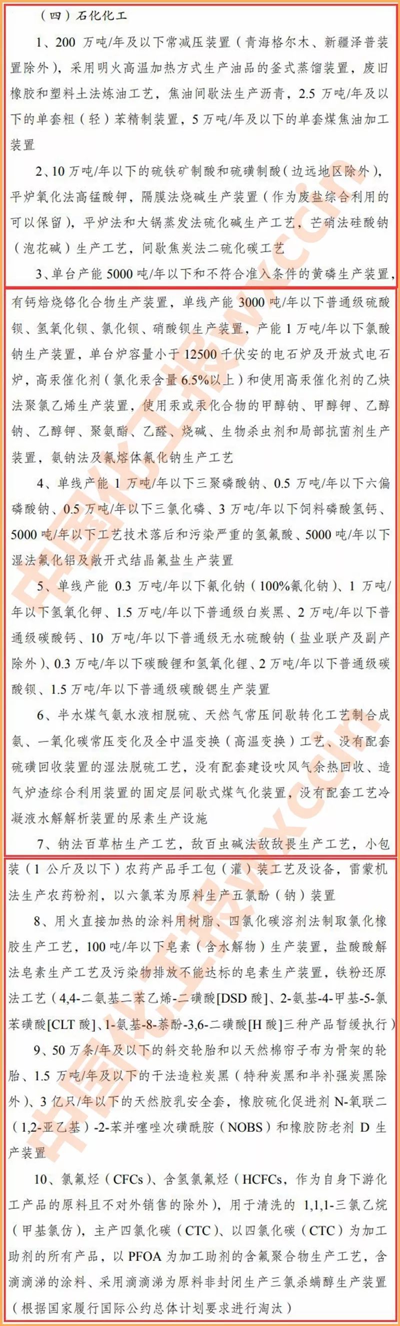 石化化工行業(yè)淘汰類(lèi)有10大類(lèi),比征求意見(jiàn)稿少了2大類(lèi),包括:200 萬(wàn)噸/年及以下常減壓裝置,2.5 萬(wàn)噸/年及以下的單套粗(輕)苯精制裝置,5 萬(wàn)噸/年及以下的單套煤焦油加工裝置;單臺(tái)產(chǎn)能 5000 噸/年以下黃磷生產(chǎn)裝置;半水煤氣氨水液相脫硫、天然氣常壓間歇轉(zhuǎn)化工藝制合成氨、一氧化碳常壓變化及全中溫變換(高溫變換)工藝、沒(méi)有配套硫磺回收裝置的濕法脫硫工藝,沒(méi)有配套建設(shè)吹風(fēng)氣余熱回收、造氣爐渣綜合利用裝置的固定層間歇式煤氣化裝置,沒(méi)有配套工藝?yán)淠核饨馕鲅b置的尿素生產(chǎn)設(shè)施;鈉法百草枯生產(chǎn)工藝,敵百蟲(chóng)堿法敵敵畏生產(chǎn)工藝,雷蒙機(jī)法生產(chǎn)農(nóng)藥粉劑,以六氯苯為原料生產(chǎn)五氯酚(鈉)裝置等。