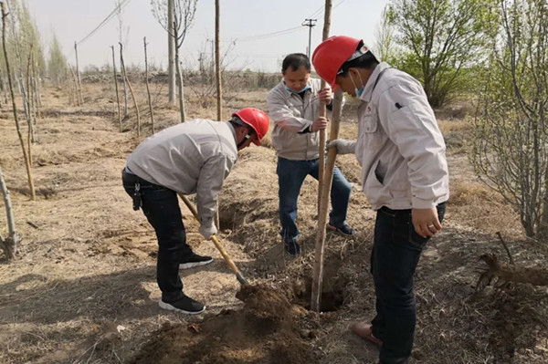 參加植樹的職工一到植樹現(xiàn)場,便投入到忙碌的工作當(dāng)中,大家爭先恐后揮鍬挖土、放苗回填,現(xiàn)場一片繁忙景象。
