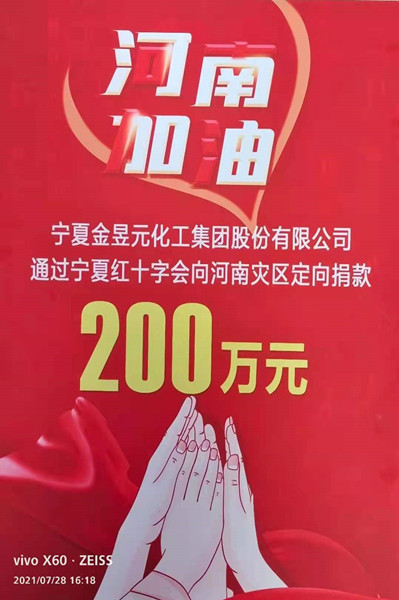 洪災(zāi)無情,人間有愛。7月28日,寧夏金昱元化工集團(tuán)股份有限公司委托寧夏紅十字會向河南災(zāi)區(qū)捐助二百萬元,馳援河南受災(zāi)地區(qū),表達(dá)對災(zāi)區(qū)人民的深切問候。