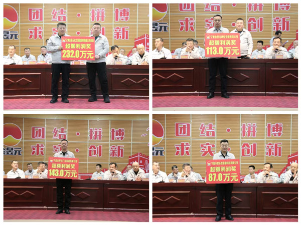對獲得“超額利潤獎”的金昱元股份公司本部、廣拓能源公司、炔烴節(jié)能公司、能源化學(xué)公司、鹽業(yè)科技公司、固原片區(qū)管理中心、捷泰物流公司、資源循環(huán)公司、青銅峽片區(qū)管理中心、金昱元股份公司供應(yīng)部、金昱元股份公司財務(wù)計劃部、金昱元集團(tuán)公司、華峰塑膠公司分別給予232萬元、143萬元、113萬元、99萬元、87萬元、83萬元、62.1萬元、35萬元、30萬元、15萬元、11萬元、6.9萬元、4萬元現(xiàn)金獎勵;對獲得“安全生產(chǎn)獎”的廣拓能源公司、炔烴節(jié)能公司、鹽業(yè)科技公司、資源循環(huán)公司、能源化學(xué)公司、固原片區(qū)管理中心、佳成礦產(chǎn)公司、捷泰物流公司、華峰塑膠公司、青銅峽片區(qū)管理中心、金昱元集團(tuán)公司、金昱元股份公司生產(chǎn)技術(shù)部分別給予32.4萬元、26.46萬元、18萬元、18萬元、15萬元、9.68萬元、7.2萬元、4.752萬元、2.7萬元、1.65萬元、1.1952萬元、1萬元現(xiàn)金獎勵;對獲得“質(zhì)量提升獎”的廣拓能源公司、能源化學(xué)公司、資源再生公司、資源循環(huán)公司、鹽業(yè)科技公司、炔烴節(jié)能公司、固原片區(qū)管理中心、青銅峽片區(qū)管理中心、金昱元股份公司供應(yīng)部、華峰塑膠公司、金昱元股份公司生產(chǎn)技術(shù)部分別給予19.575萬元、17.82萬元、16.2萬元、13.095萬元、9萬元、8.91萬元、4.98萬元、3.36萬元、1.8萬元、1.638萬元、1萬元現(xiàn)金獎勵。